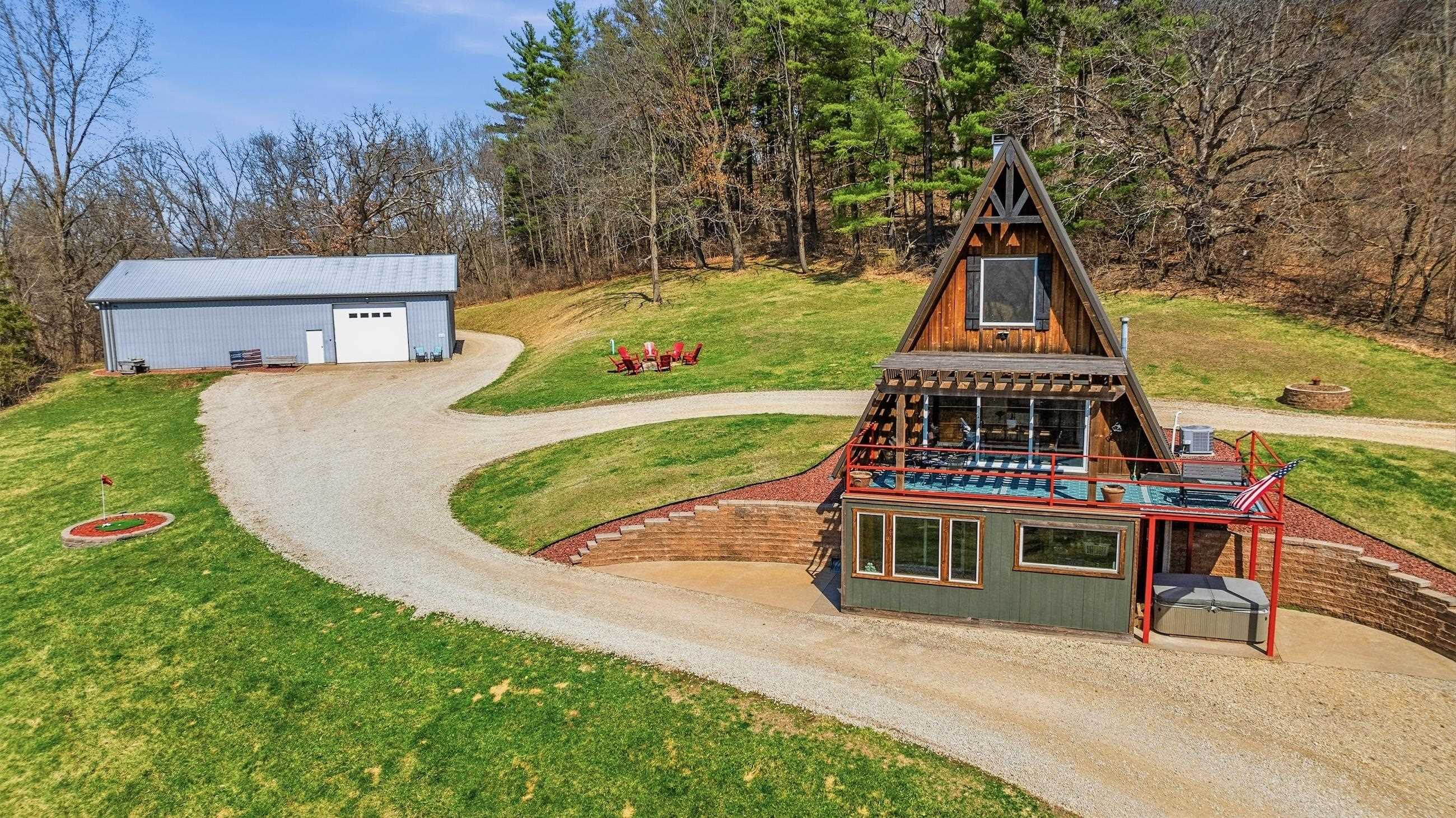 Escape to your own private retreat just minutes from Dubuque at 14847 Lost Canyon Road. Situated on 54.99 scenic acres, this unique property blends outdoor recreation, natural beauty, and comfortable living. The charming 3-bedroom, 2-bath A-frame home offers rustic character with modern comforts, including a metal roof, gas fireplace, porch, deck, and patio. This makes it perfect for enjoying the peaceful surroundings. A hot tub and fire pit add to the inviting outdoor living experience. The land is truly exceptional, featuring a picturesque 1.5-acre spring-fed pond, a running creek, beautiful grass fields, and standing walnut timber. Outdoor enthusiasts will appreciate miles of established UTV and Jeep trails, a 2.5-acre dirt bike track, grass volleyball court, and a private rifle range extending out to 500 yards. The property also offers outstanding whitetail deer and turkey hunting opportunities. A 40 ft x 66 ft heated shop with concrete floors, large overhead door, and an attached 18 ft x 56 ft lean-to provides ample space for all you equipment and hobbies. The shop is insulated and equipped with a wood boiler and hanging forced air heat for year-round functionality. Conveniently located just 5 minutes from Menards this property sits on the edge of Dubuque city limits, offering privacy without sacrificing accessibility. A rare opportunity to own a versatile recreational haven with endless possibilities. Shown by appointment only. Do not drive down the private lane without an agent and a confirmed showing.