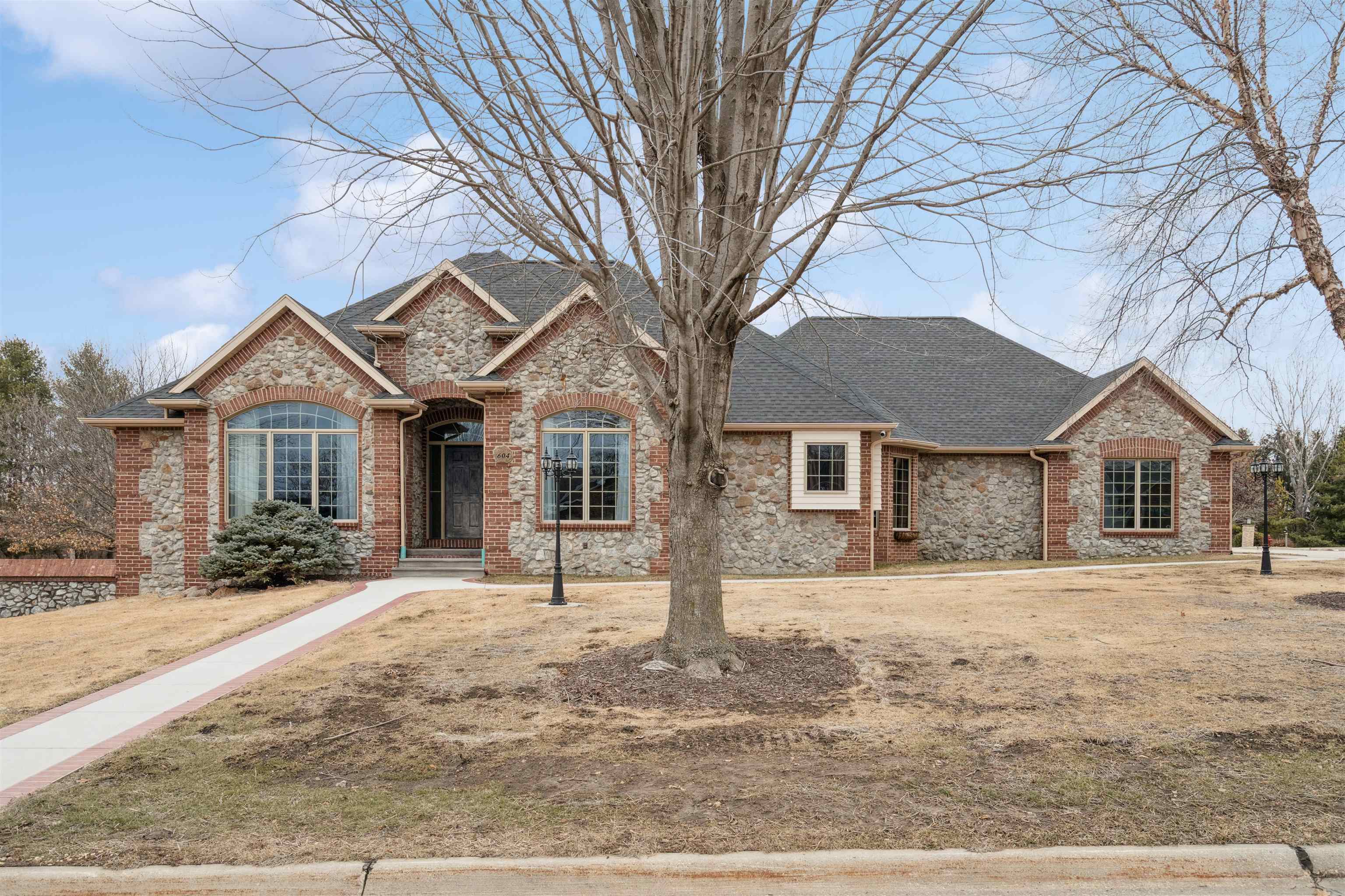Beautiful ranch home offering spacious living, thoughtful design, and incredible indoor and outdoor entertaining spaces in a desirable Dyersville neighborhood. The main floor welcomes you with a large living room featuring a gas fireplace that flows seamlessly into the dining area, creating an open and inviting space perfect for everyday living and gatherings. A door from the living room leads to an amazing outdoor living space with a partially covered patio and built-in wood fireplace, ideal for relaxing evenings or entertaining family and friends. The eat-in kitchen includes a pantry and plenty of workspace, while the nearby half bath and laundry room are conveniently located just inside the entrance from the heated three-car attached garage. The garage also offers direct stair access to the finished lower level. The spacious primary suite features a stunning two-sided gas fireplace shared with the bathroom, creating a true retreat. The en suite bath includes a soaking tub, separate shower, and walk-in closet. Two additional bedrooms are located on the main floor with a Jack-and-Jill bathroom between them. The finished lower level provides exceptional additional living space, including a huge family room with a gas fireplace, two more bedrooms connected by a Jack-and-Jill bathroom, a game or hobby room area, and a separate room ideal for a home gym or workout space. The exterior showcases beautiful stone and brick accents, along with sidewalks surrounding the home featuring decorative stamped borders, adding both curb appeal and function. Located in a highly desirable area of Dyersville, this home is within walking distance to parks, soccer and baseball fields, pickleball courts, schools, and the hospital, making it easy to enjoy recreation, community activities, and everyday conveniences. With five bedrooms, multiple fireplaces, generous living spaces, and exceptional outdoor entertaining areas, this impressive ranch home is truly a must see.